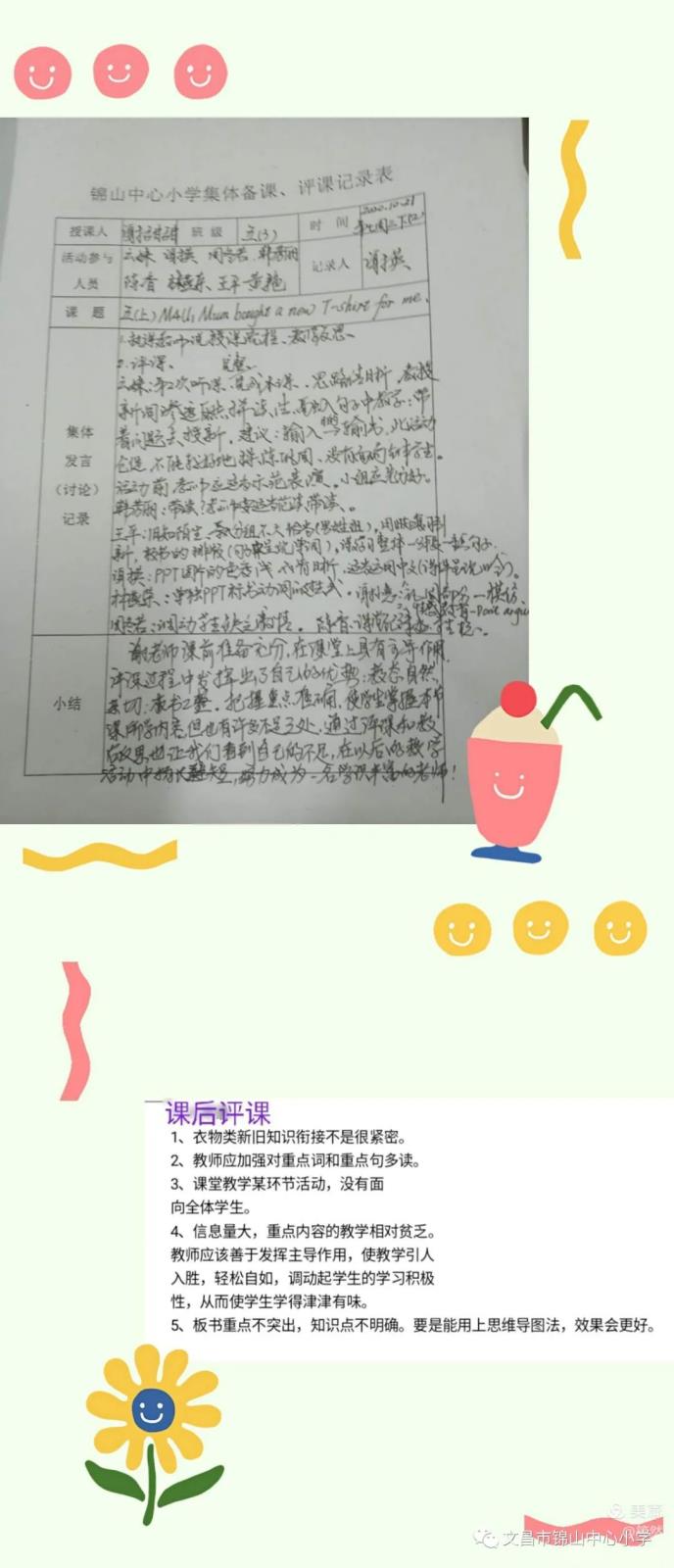 课后,听课老师们对这堂课给予较高的评价,大家对谢老师自如从容的良好教态,流利的英语口语及优美的语音语调给予充分的肯定。同时,针对课堂教学、合作练习等方面进行细致的交流研讨,并提出了中肯有效的建议。
