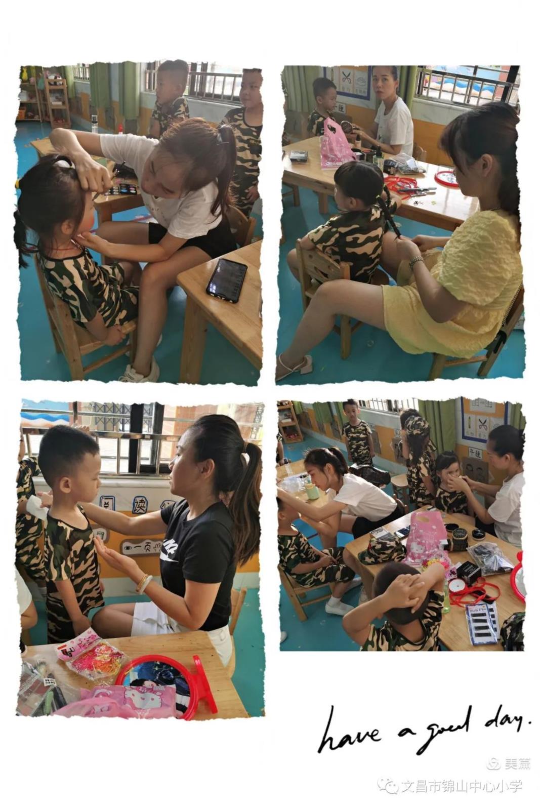 老师们、家长们正在给孩子们化妆、换衣服,做节目开始前的准备工作。