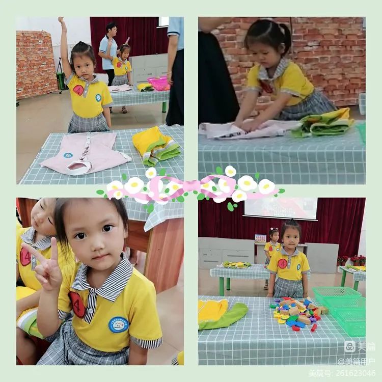 【比赛规则】在规定时间内,完成收拾玩具、叠衣服、扣纽扣三种技能,要求能够把玩具分类放在篮子里,衣服叠整齐,扣纽扣是将衣服纽扣对齐并扣好。质量同等下,看谁用时少。(每位幼儿都由一位老师负责计时,一位老师负责监督)
