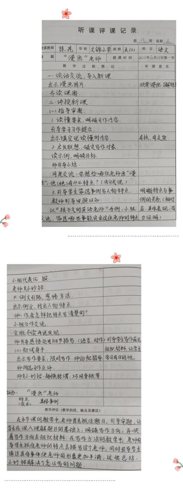 陈花老师由几幅人物漫画导入,引出本节课的习作内容。整节课,陈花老师能按照集体备课形成的共案组织教学,认真把握教学重难点,教学环节环环相扣,收到了良好的教学效果。